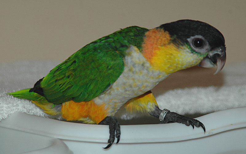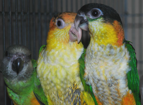 ![]() Black-Headed and Yellow-Thighed Caiques cavort in the nursery |