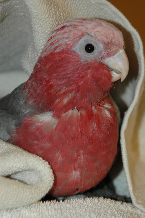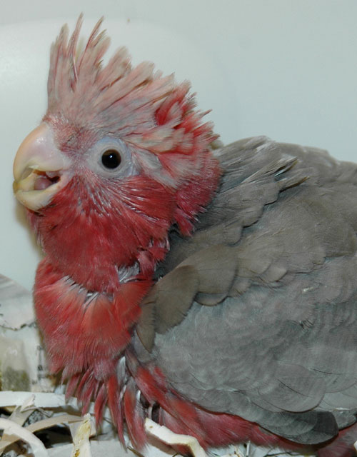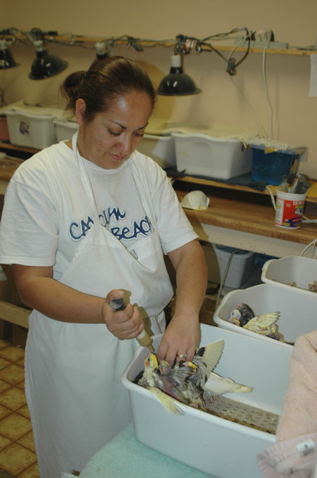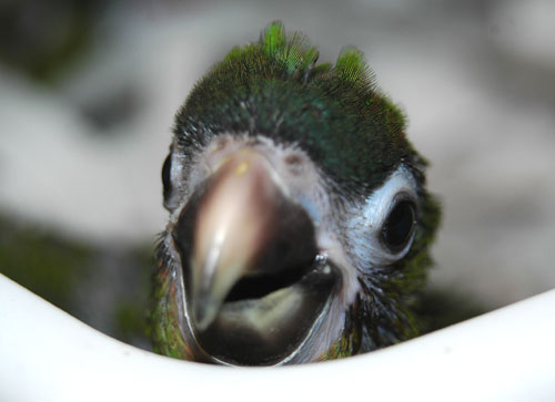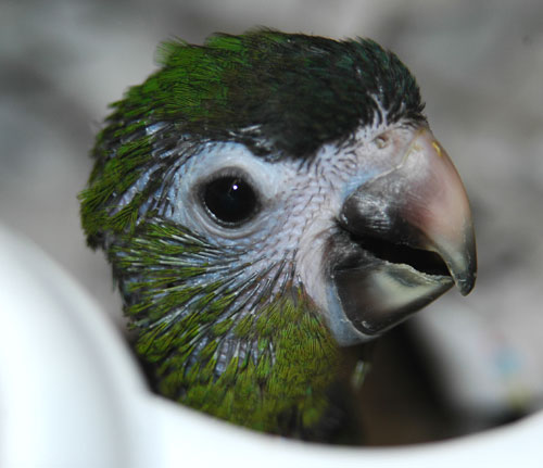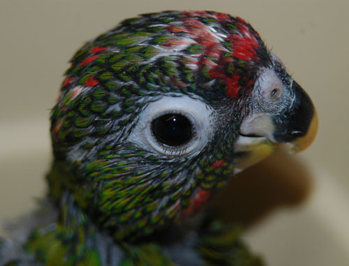 ![]() Our nursery manager, Chelo, hand-feeds baby cockatiels ![]() This baby Maximillian Pionus has a lot of juvenile red coloration on its head |