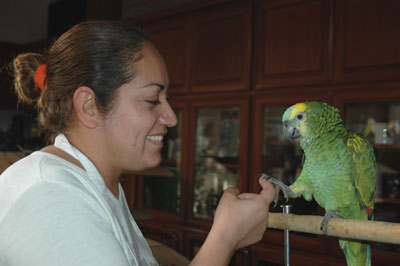 ![]() Our nursery manager, Chelo, plays with a young Blue-Fronted Amazon on 1/16/08. |