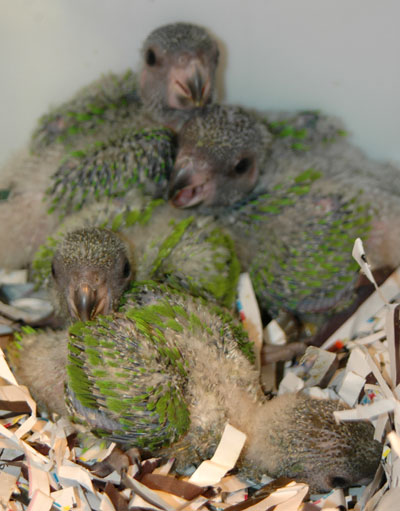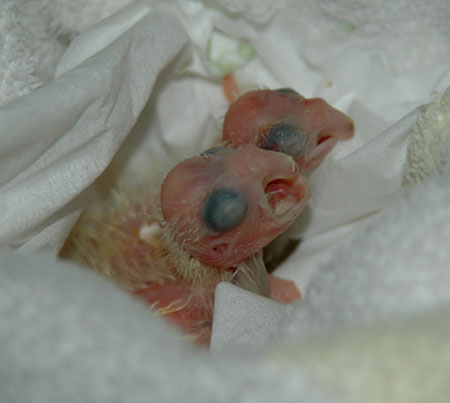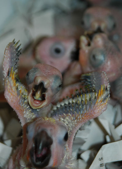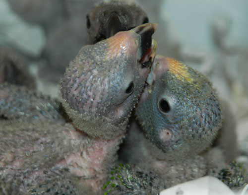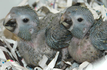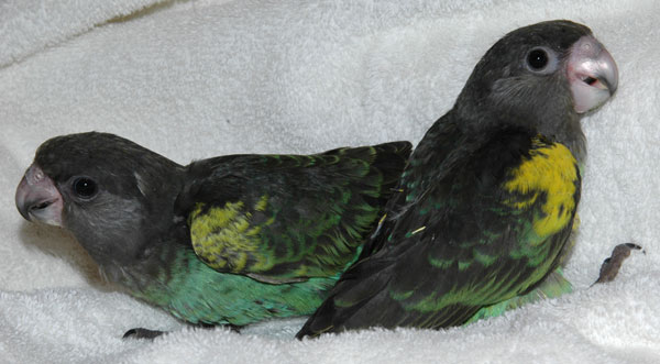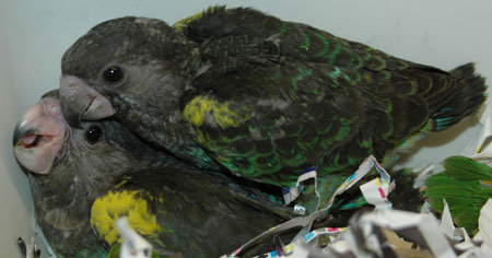 ![]() baby Congo African Grey (at left and above) ![]() two baby Meyer's Parrots image taken 2/9/08 |