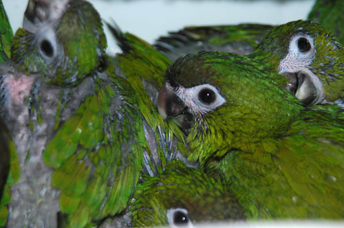 ![]() It's a free-for-all for these baby Sun Conures and Bronze-Winged Pionus as they see the hand-feeder approaching! ![]() Senegal Parrot with a Yellow-Thighed and Black-Headed Caique |