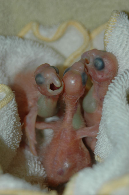 ![]() Two baby Panama Amazons "beak" with a baby Timneh African Grey as they wait for the hand-feeder on 4/30/08. |